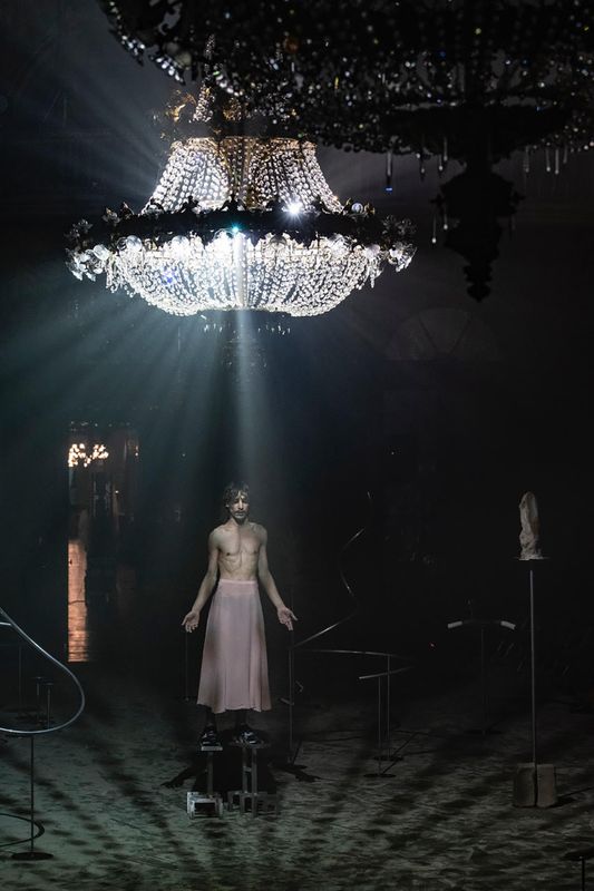 Dat doet hij ook in A Revue zelf, door los van genres of genders een eclectisch universum te creëren waarin het heerlijk toeven is. Met dank ook aan de prachtige locatie van de Lullyzaal in de Gentse opera – denk Louis XIV in Versailles – die Meirhaeghe en zijn scenograaf en lichtontwerper Bart Van Merode zeer sfeervol hebben ingekleed. Ook inhoudelijk wordt er slim op de gekozen speelplek gereflecteerd, via een personage dat de stem vertolkt van het gebouw. Het maakt ons benieuwd hoe A Revue er zal uitzien op andere locaties, wanneer het stuk op tournee gaat.