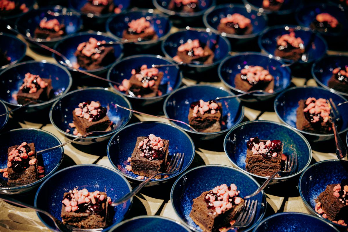 Appetizer 2, halverwege het voorprogramma: Keti Koti cake, een cassave cake met o.a. kokosmelk, cassave en gecondenseerde melk, in combinatie met passievrucht en mango.