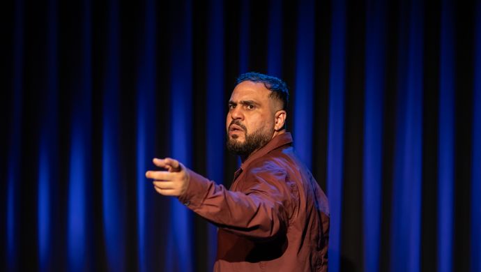 “Dat krijgt verschillende vormen. Het begint met een korte film, die zich afspeelt in Suriname, waarin we iemand zien wegrennen. Eerst denk je misschien dat hij ergens voor wegrent, maar eigenlijk rent hij ergens naar toe. Die plek is op het Brokopondo-stuwmeer. Daar woonden zijn voorouders, voordat het onder water kwam te staan. Niet geheel toevallig is dat ook het geval met mijn eigen voorouders. Op het meer raakt hij bedwelmd door de zon en de hitte en valt in het water. Dan geeft hij zich over aan het water, hij voelt zich als het ware veilig in de buik van moeder aarde. Dat is het moment dat we schakelen naar het toneel. In die momenten onder water speelt de rest van de voorstelling zich af. De filmbeelden blijven steeds een rol hebben, samen met zeven dansers op het podium, met livemuziek en ik doe zelf ook mee, als voordrager van teksten.”