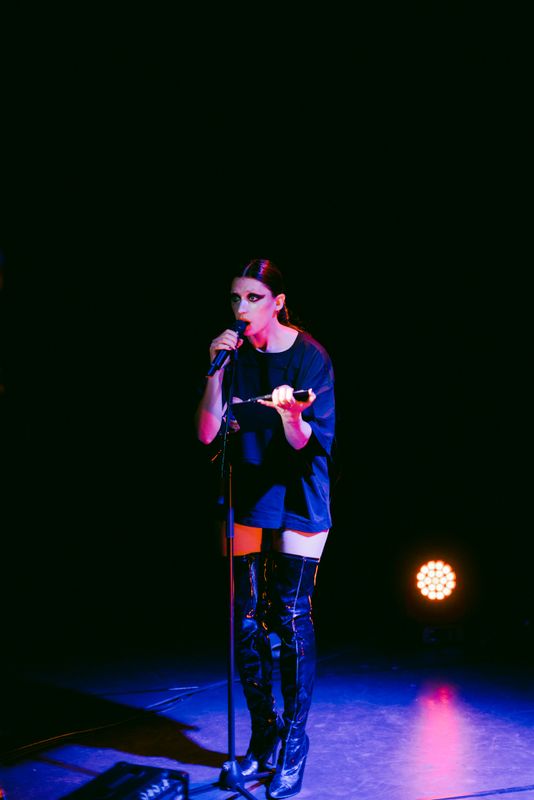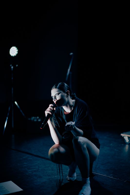 Hélène Vrijdag (1996, Rennes, FR) (she/her/they) is a Rotterdam-based performer, singer, writer and weaver. She studied Performance at the Academy of Performative Arts in Maastricht and is currently finishing her Masters degree in Gender Studies at Utrecht University. She combines her artistic practice with queer and feminist academic research focused on musicology, pop culture and mythology.