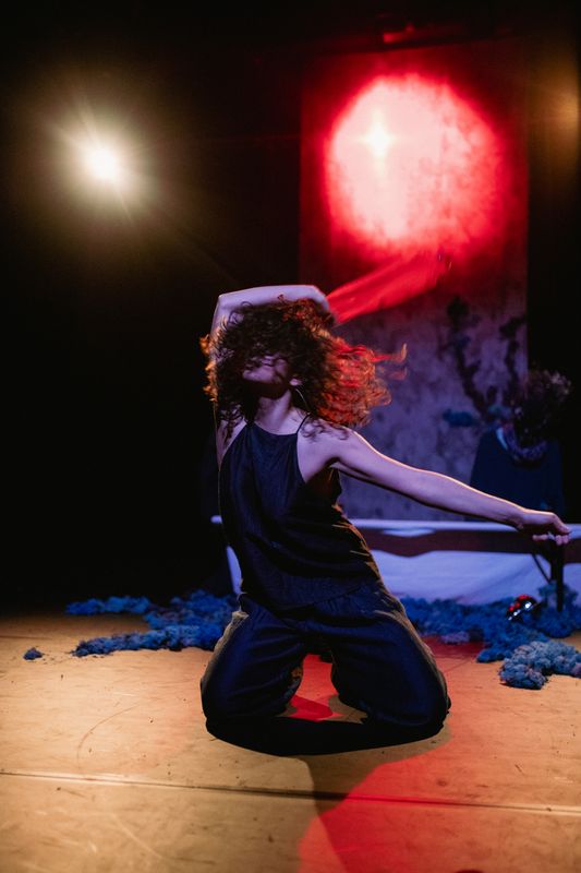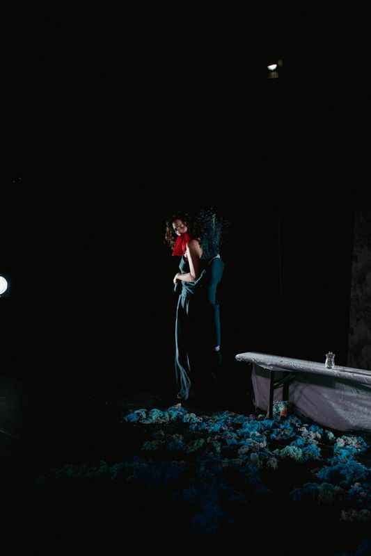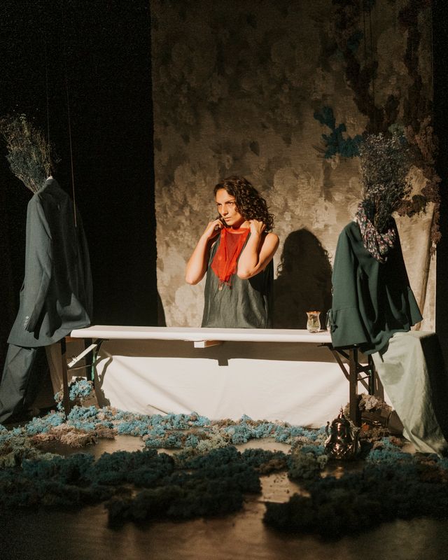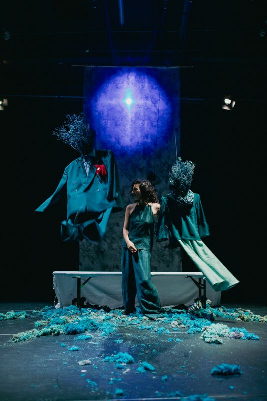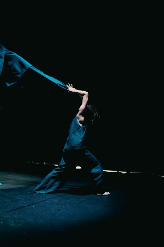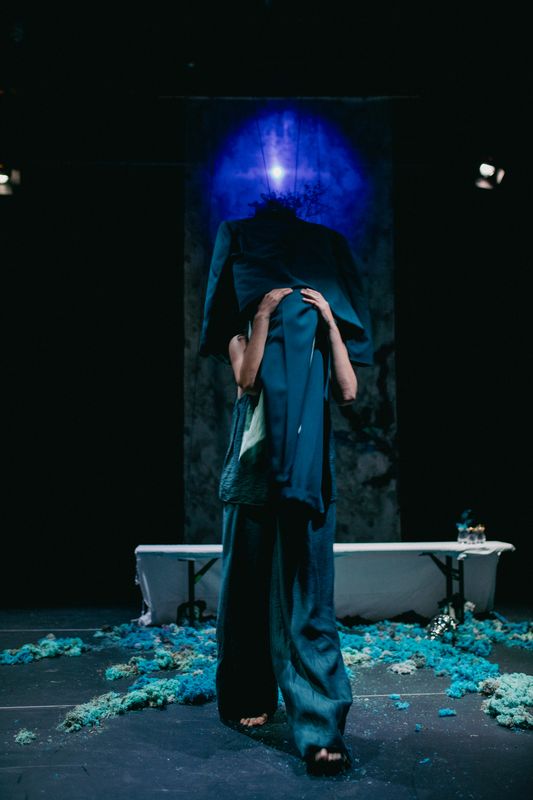 Met de sterke scenografie zet ze een sfeerbeeld neer dat nostalgisch en liefdevol is, maar toch ook eenzaam aanvoelt. De twee fladderende kostuums aan weerszijden van haar, komen tot leven in een magisch mooi spel en bieden op subtiele wijze de ingang naar het milieu waartoe ze zich samen met ons wil verhouden. Haar dans is vurig en passievol, haar blik is zoekend en de verbeelding van haar worsteling is krachtig.