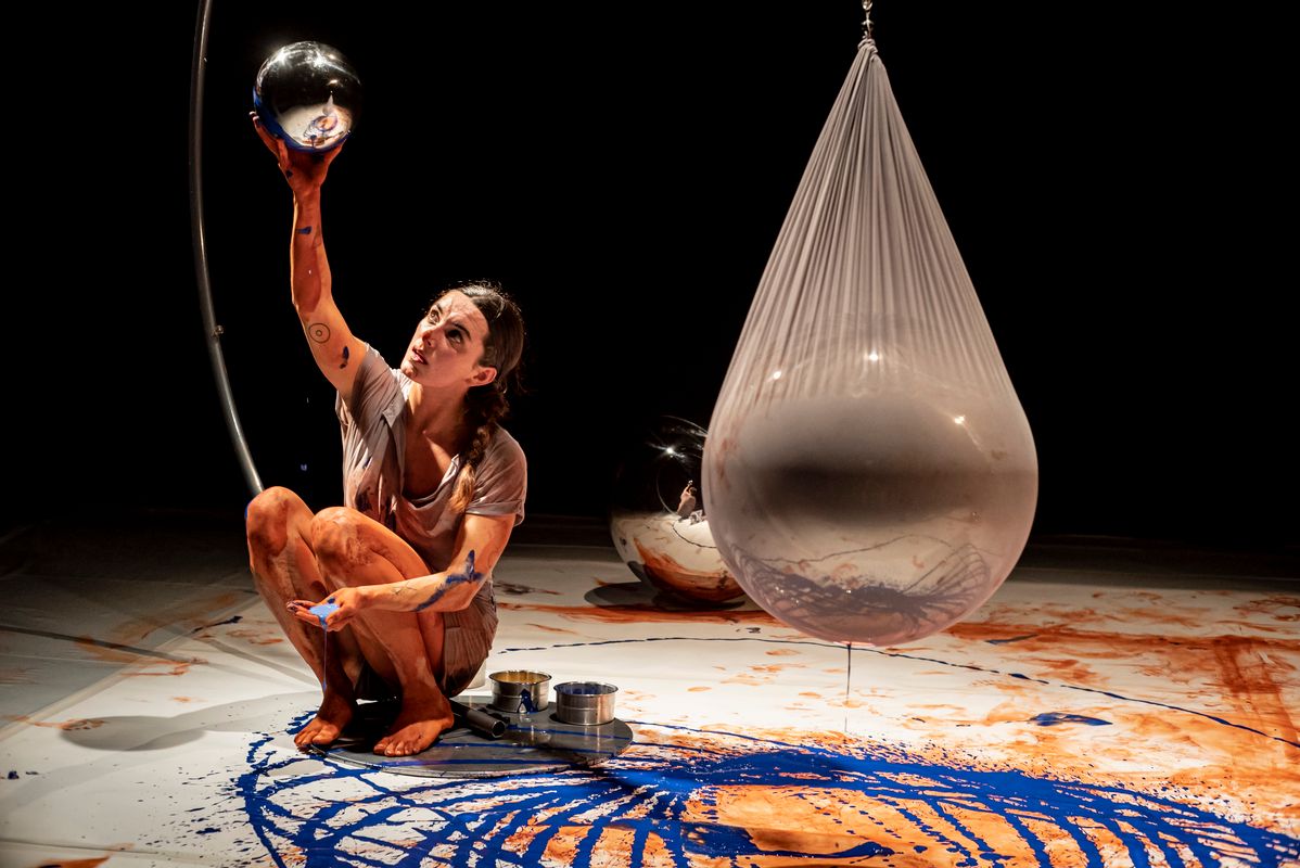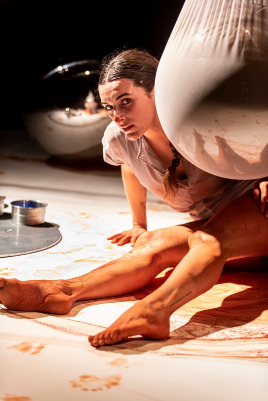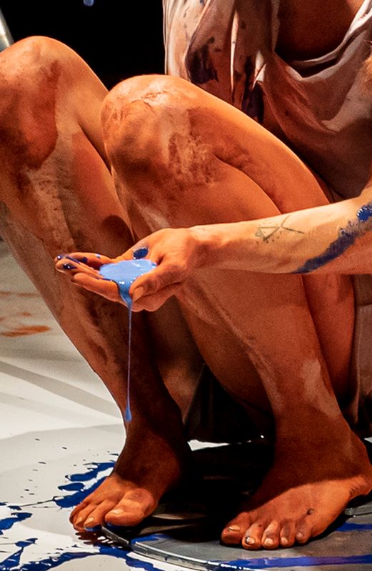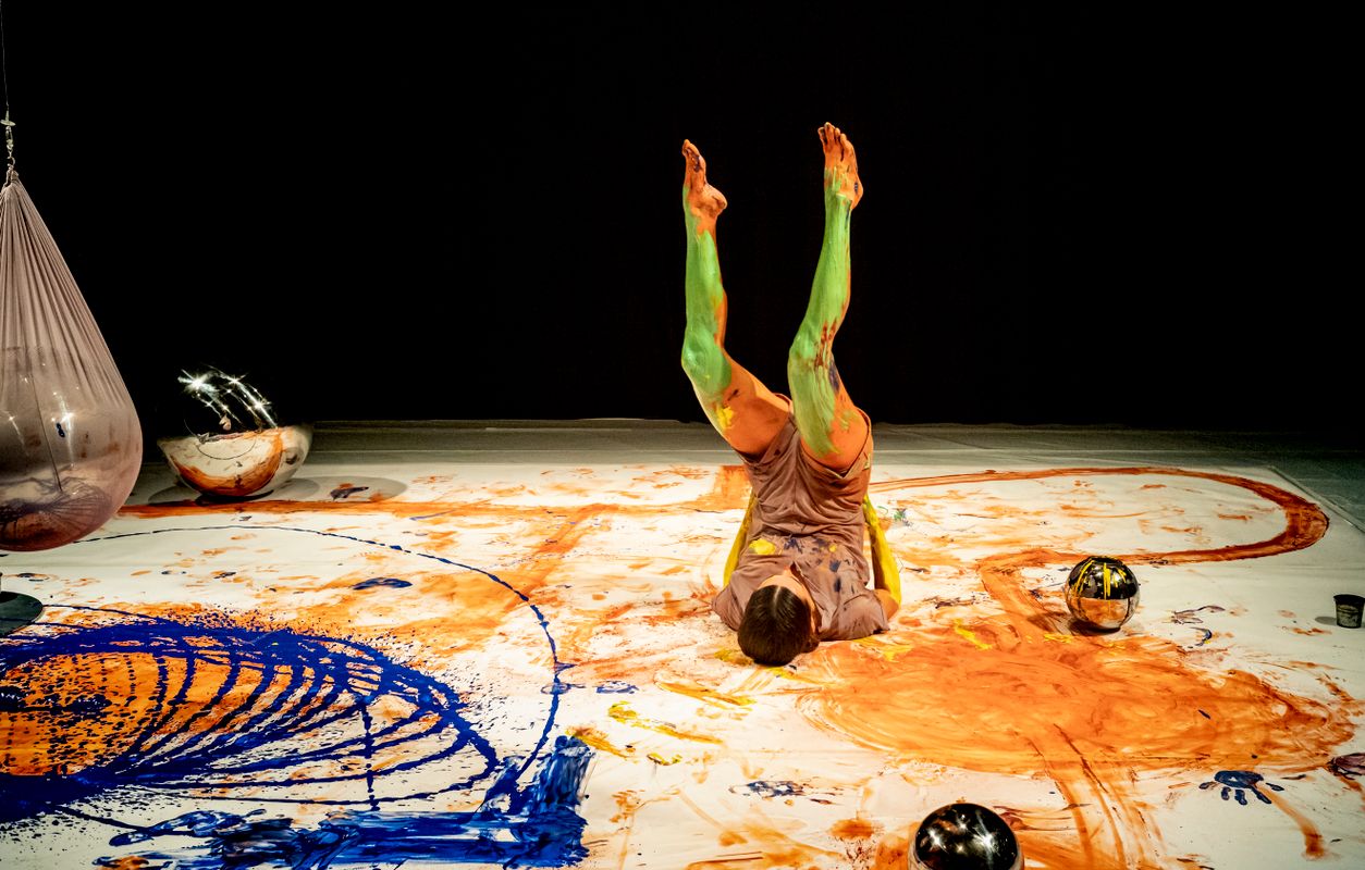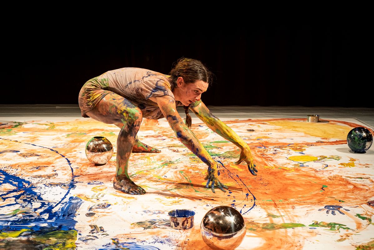 Ze sluipt, rolt en draait over een papieren vloer en laat gekleurde sporen achter in rood, blauw, geel en groen. Langzaamaan ontstaat er een kleurrijk schilderij, niet alleen gemaakt met kwasten, handen en vingers, maar met het hele lichaam.