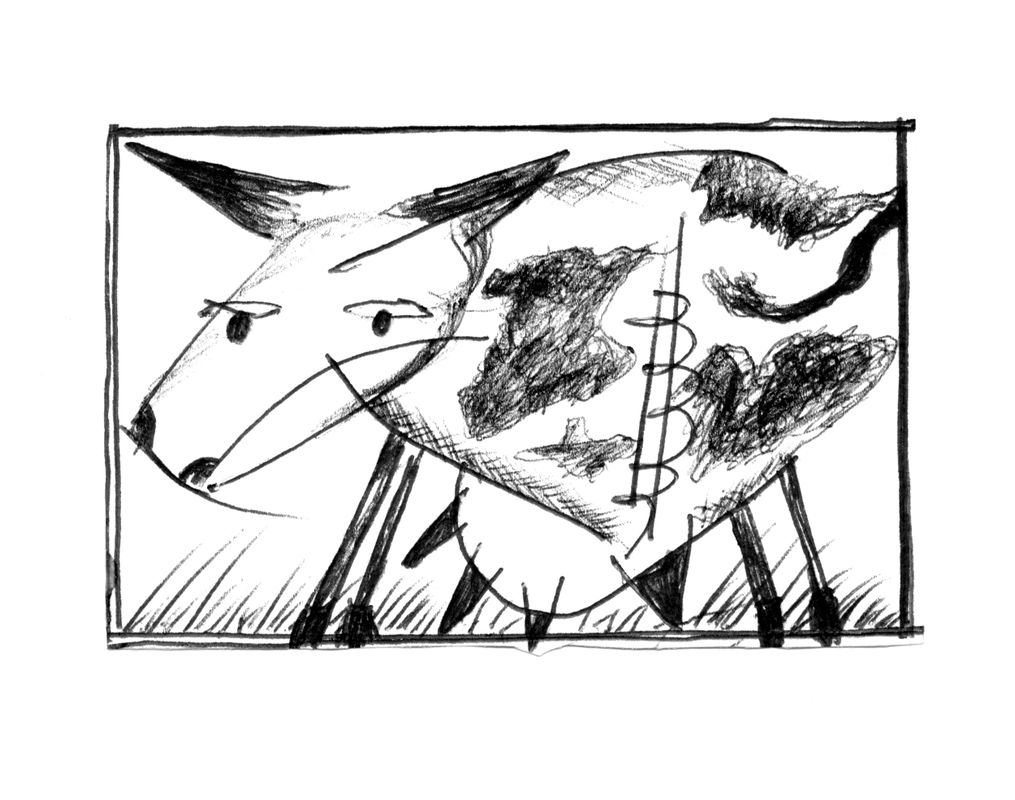 Een boer, een boerin, het platteland en zes koeien, waaronder weidekoeien, luchtkoeien en een waterkalf. Aan de hemel staat een bijenkorf. Op aarde de betoverende Almide, voor wie de boer dreigt te vallen.