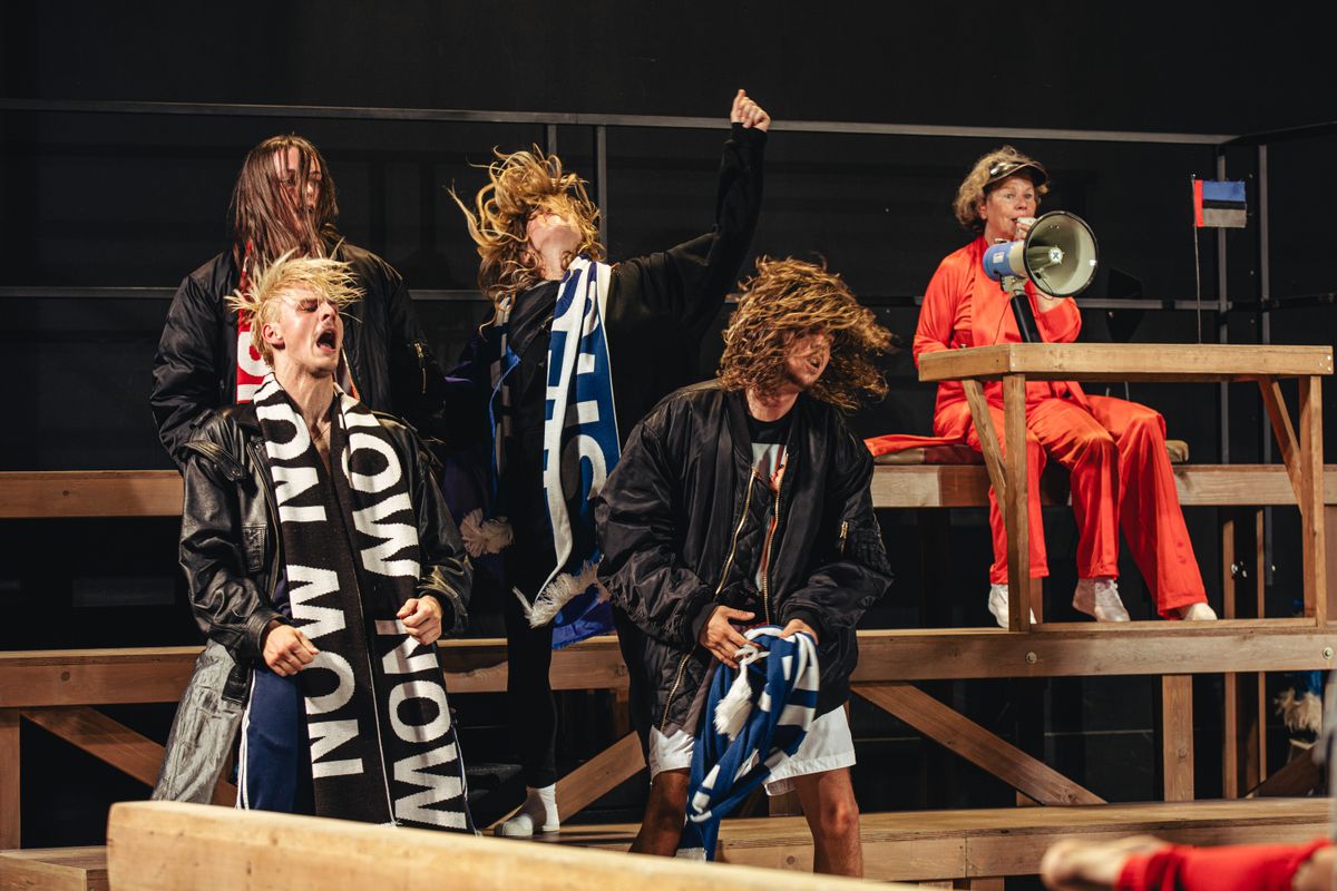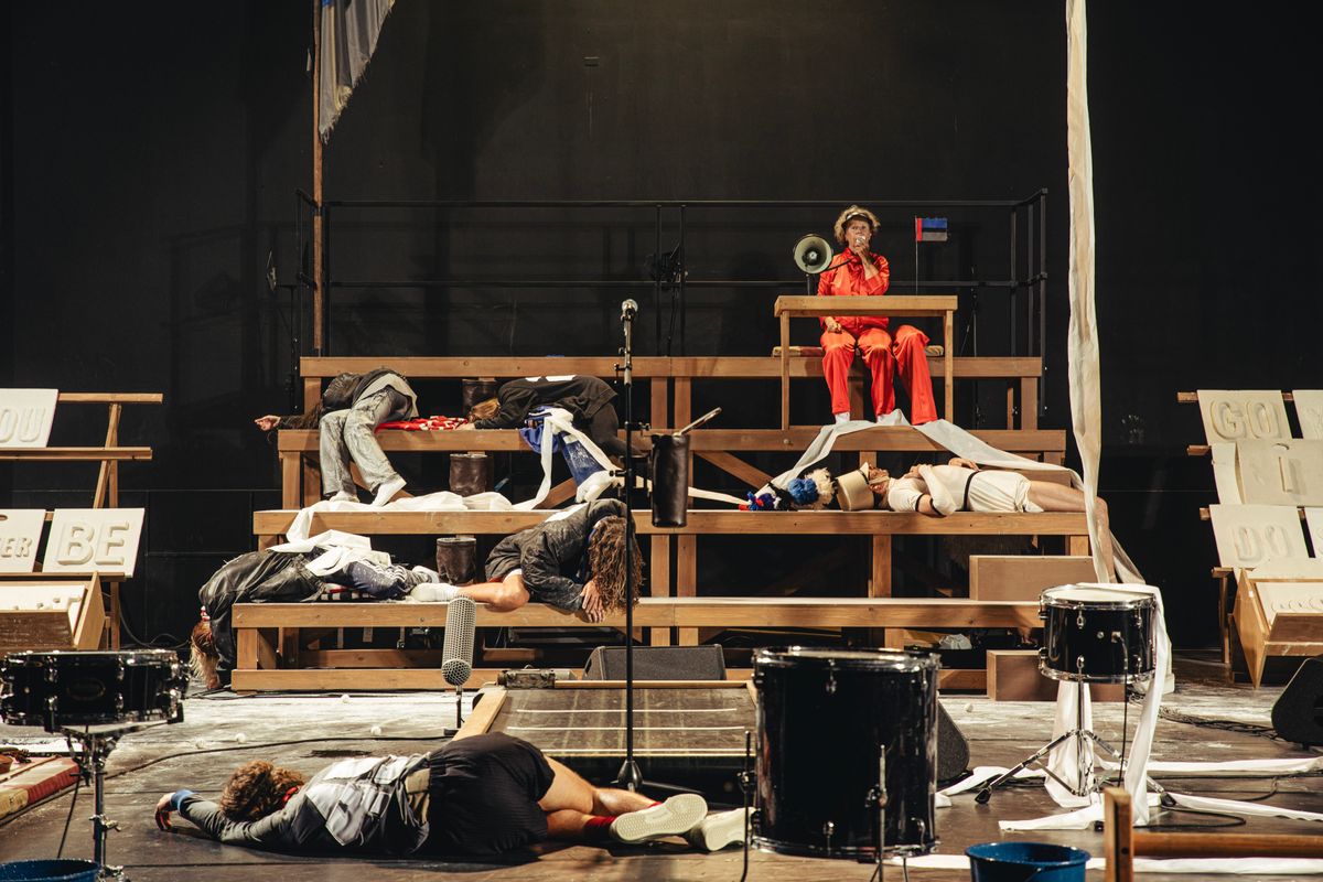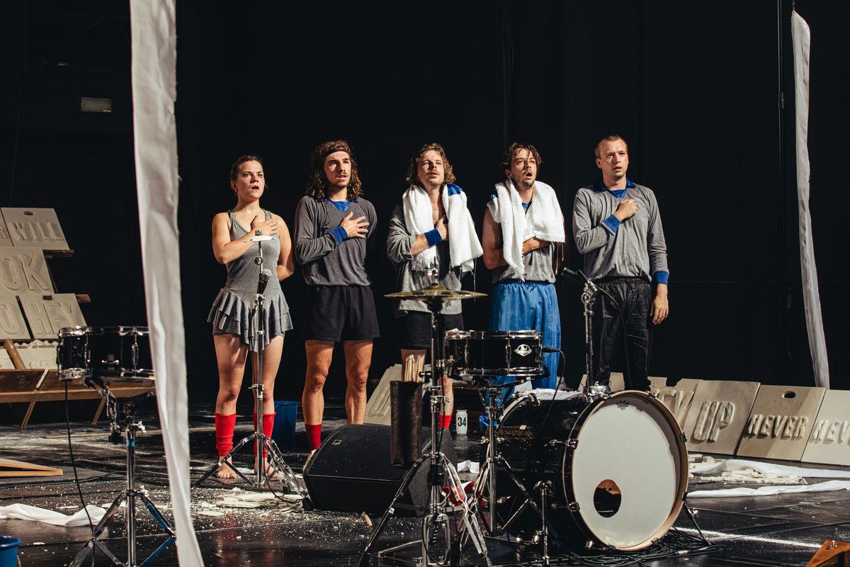 Through the metaphor of a live competition/concert, including a commentator and a cheerleader, Miet Warlop invites us to form a community and lift each other up, as in a celebration. The temporary thus becomes the universal, and the personal becomes something of the collective. That is the subtext of ONE SONG: how one song can give meaning to a whole society. Unity in diversity.