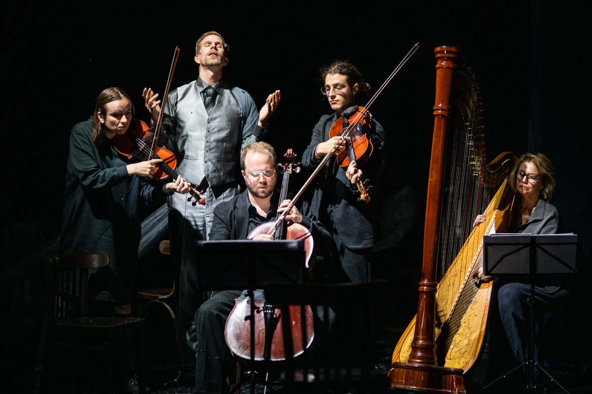 Een bijzondere keuze van regisseur Ola Mafaalani is om de acteurs op het podium door strijkers van het New European Ensemble te laten vergezellen. Met veel gevoel voor finesse ondersteunen ze het stuk met soms opgewonden, soms melancholische klanken.