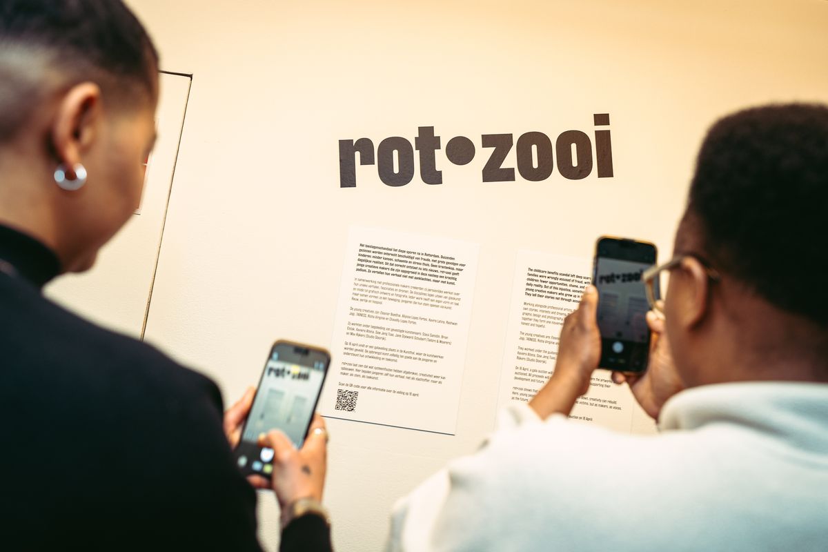 rot•zooi – rotterdam zet omstandigheden om in – geeft jongeren die geraakt zijn door het toeslagenschandaal de ruimte om hun ervaringen te verbeelden, te delen en opnieuw vorm te geven. Tijdens de veiling nemen zij letterlijk en figuurlijk het podium: een moment waarop hun werk wordt gezien, gewaardeerd en ondersteund.
