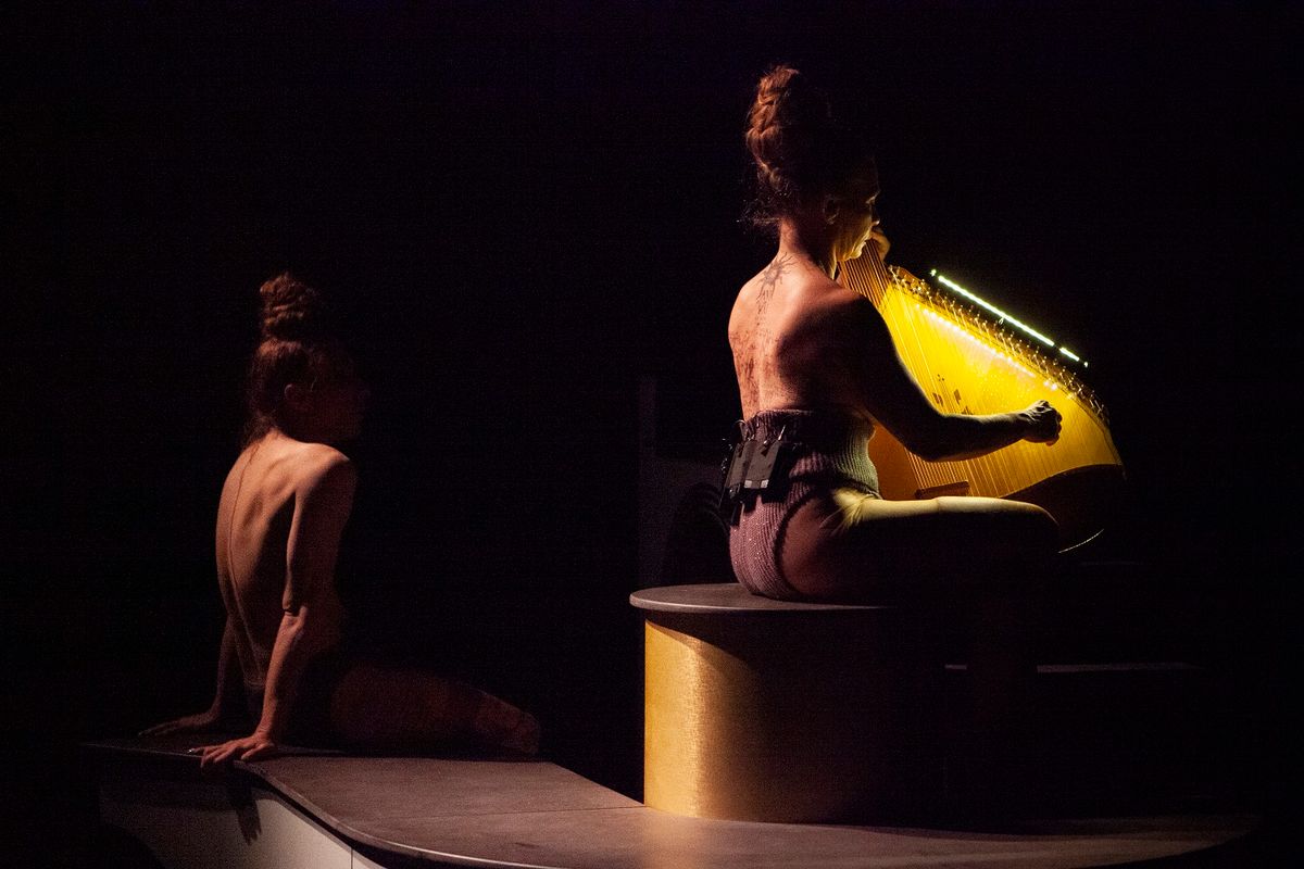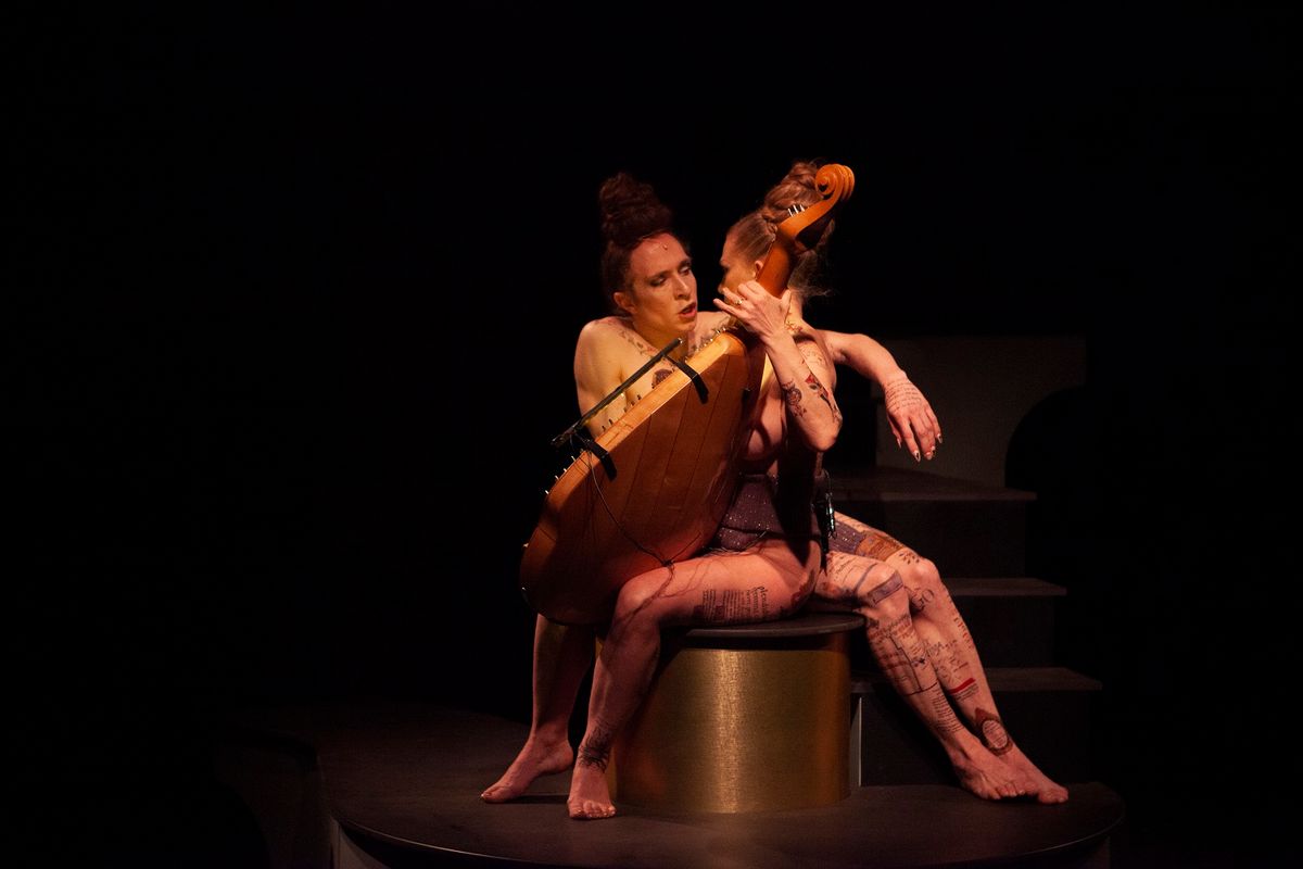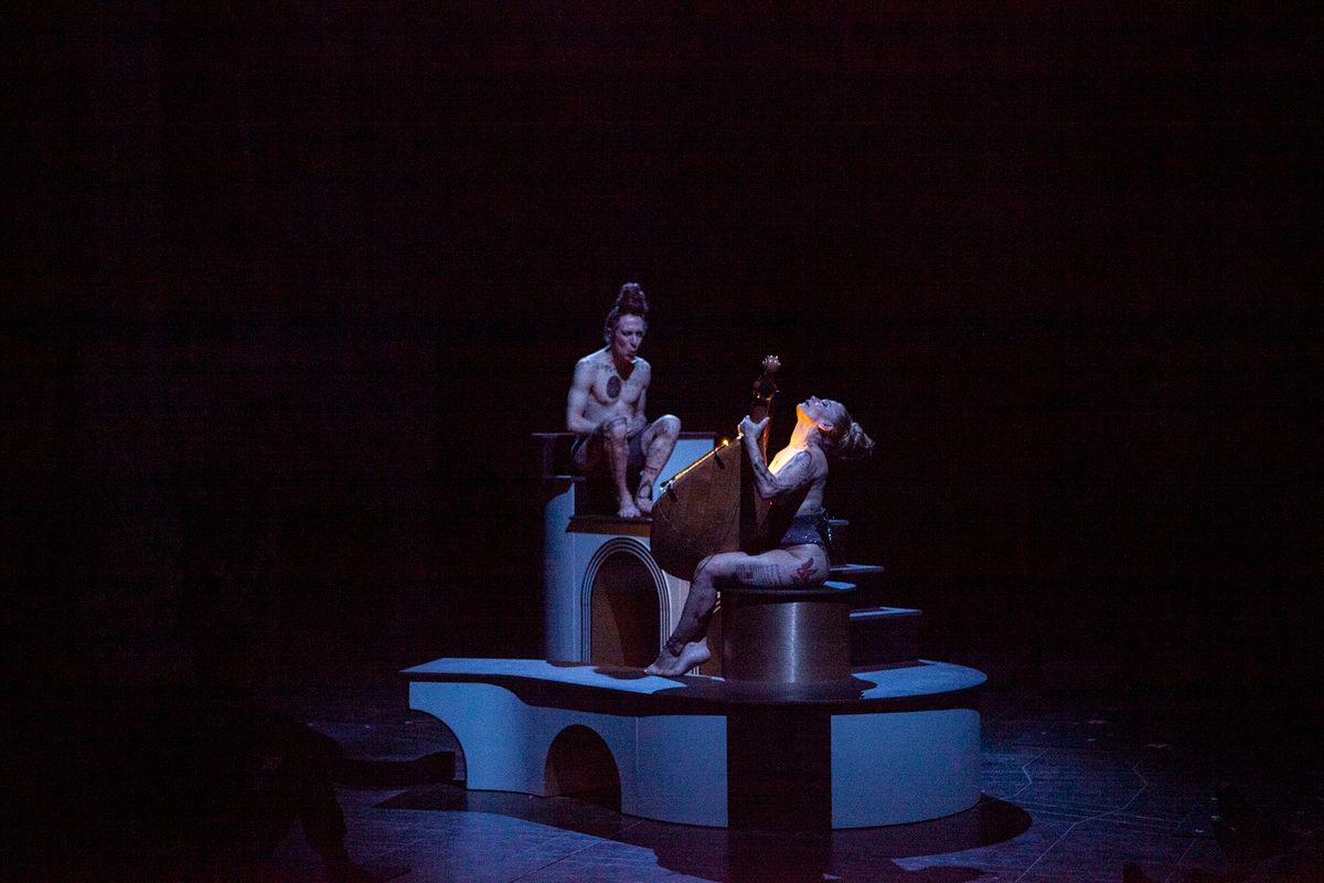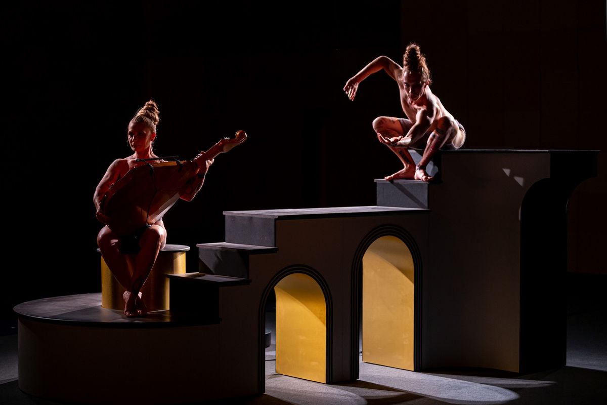 Chaignaud and Brébant create a meditative, mesmerising and at times ecstatic sonic universe, using only a voice and the bandura, a classic Ukrainian string instrument based on the lute. They aren’t using sheet music. Their singing and playing are a purely physical creation, their moving bodies tattooed with Hildegard’s lyrics and imagery.