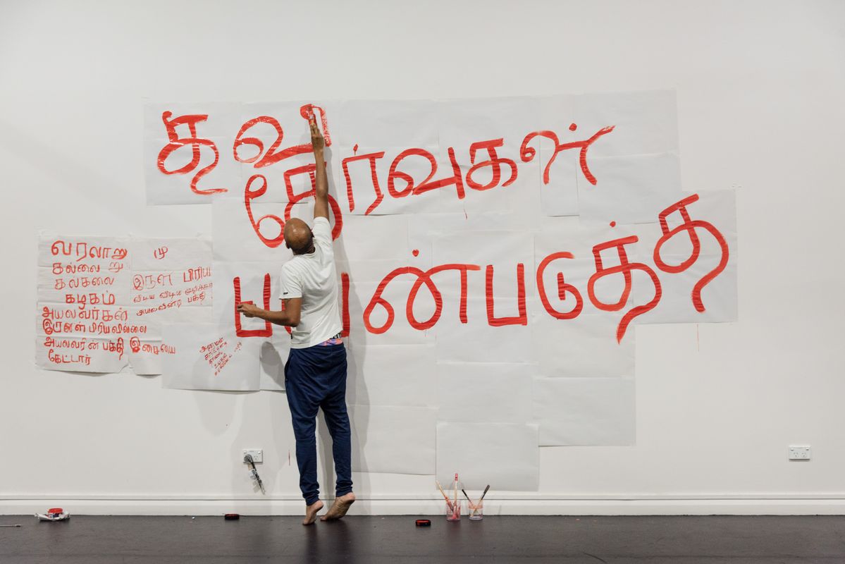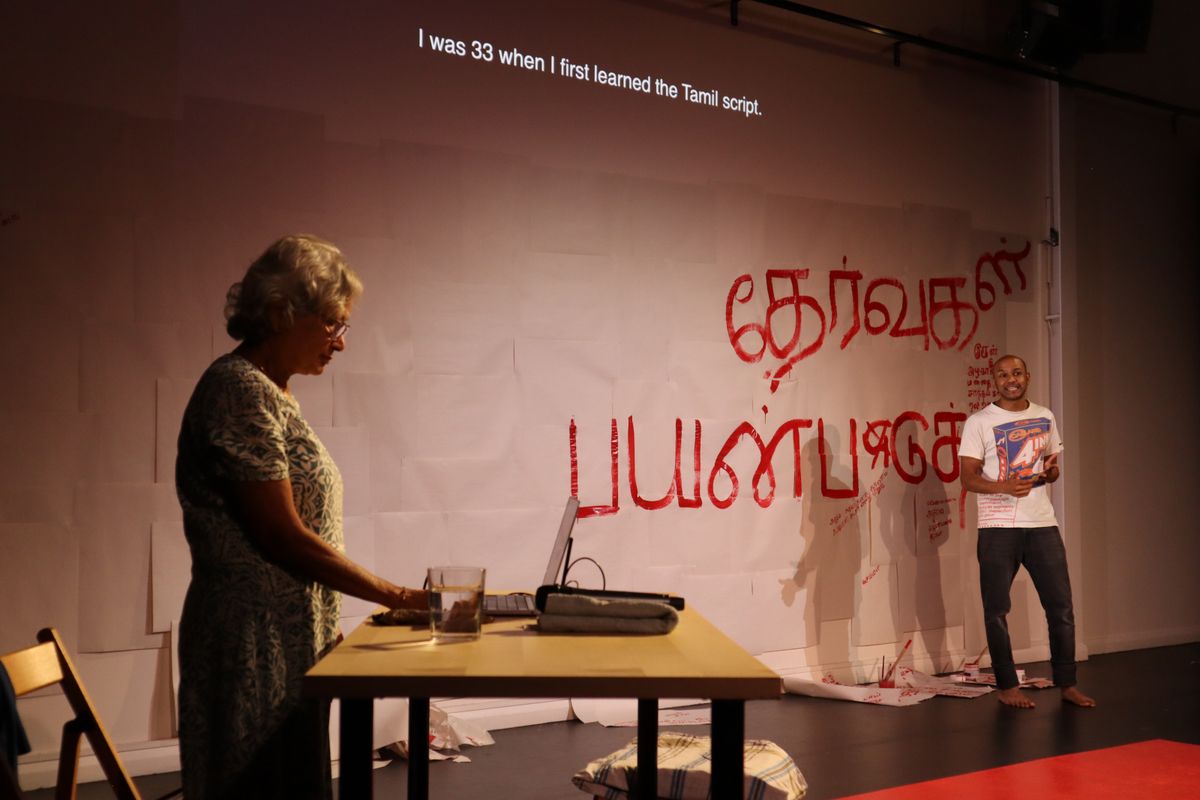 During his youth in Sydney, Ahilan never learned Tamil. Over the past seven years, he searched for ways to try to learn Tamil, but no book or app sufficed. It quickly became clear to him that he would have to study for hours in order to perfectly master the spoken Tamil of his parents. You don’t learn Jaffna Tamil from textbooks or by watching the news. The language is passed on through (grand)parents and diaspora gatherings across the world. That makes it beautiful, but elusive. Through Skype conversations, Ahilan’s mother taught him Tamil over the past five years, which ultimately led to the creation of the performance.