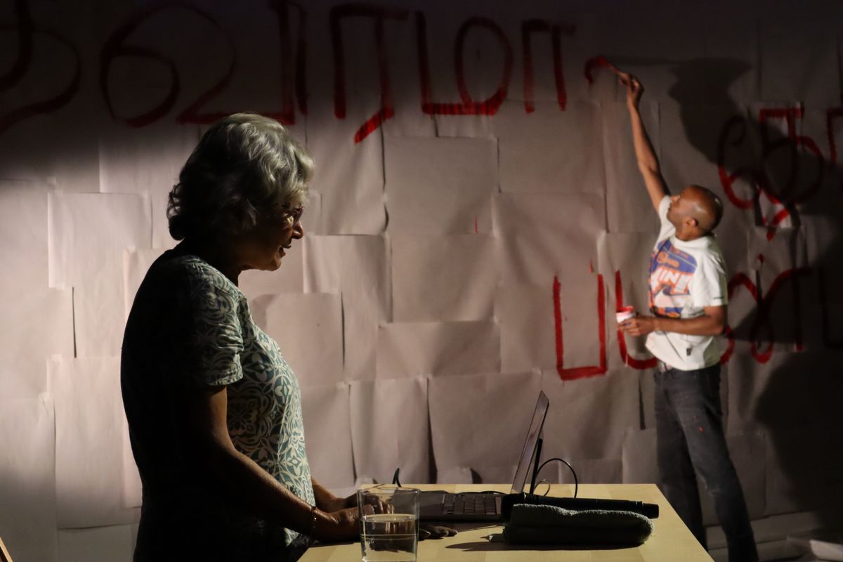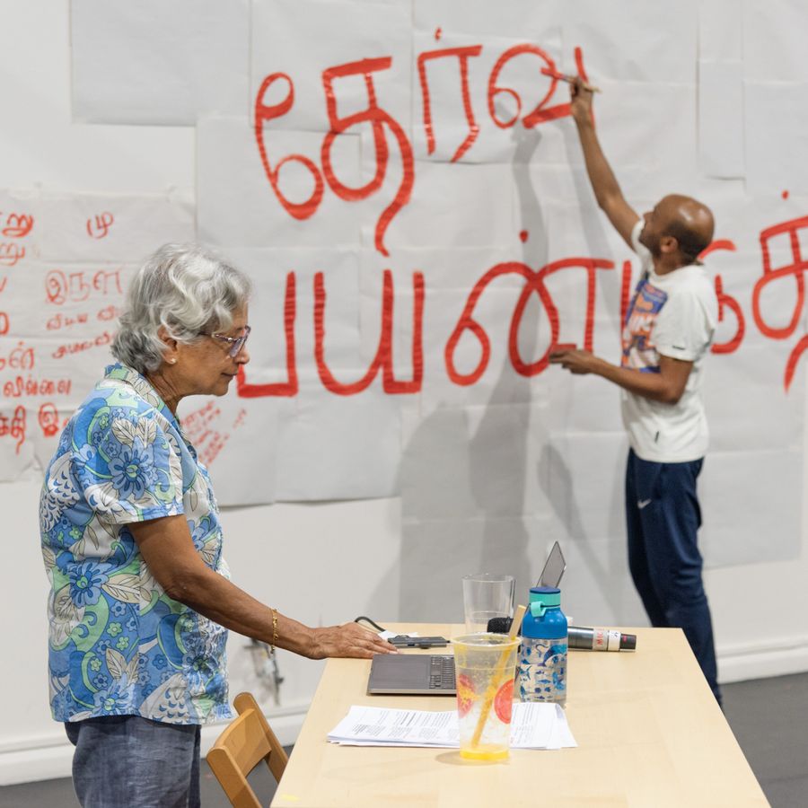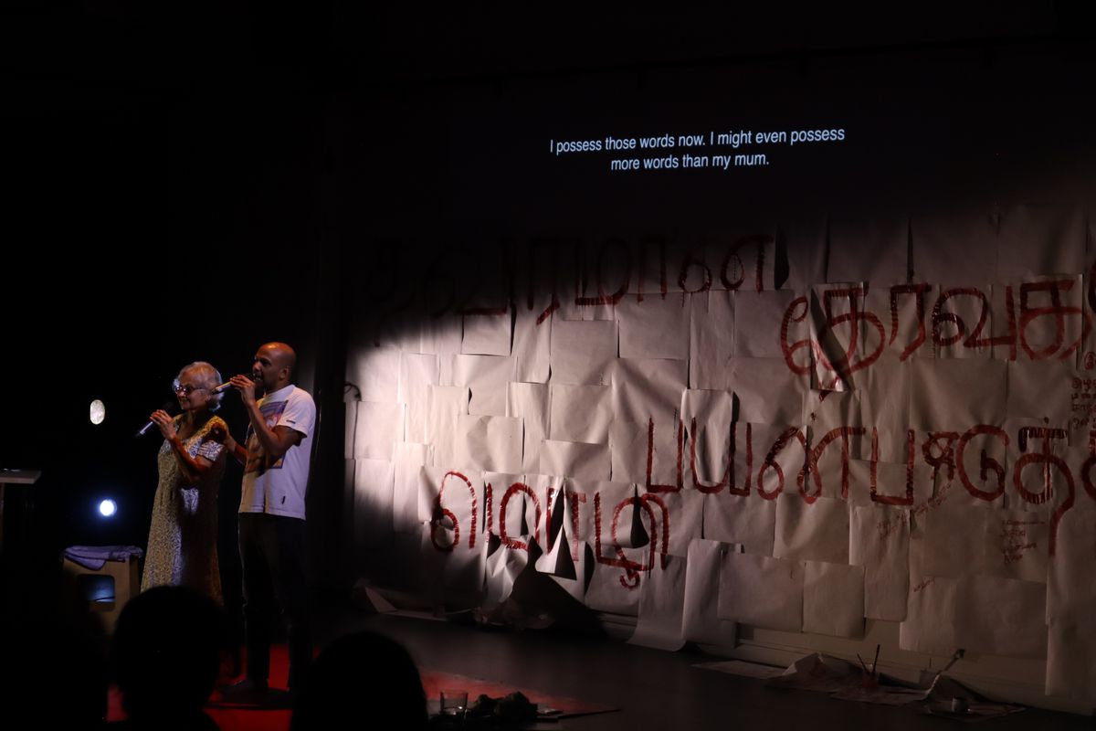 A personal story about memory, loss, a fascination with language, identity, and diaspora. Ahilan performs the piece entirely in Tamil—the language of his mother, which is not his mother tongue, as he was raised speaking English. His mother sits beside him on stage, correcting and supporting him.