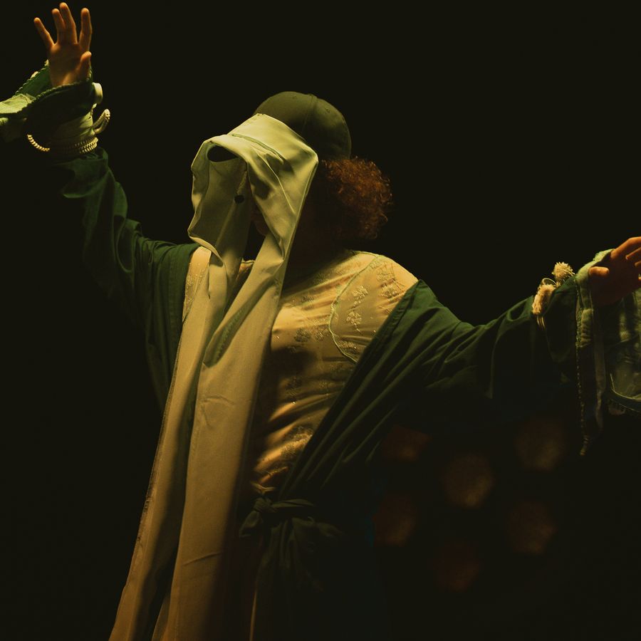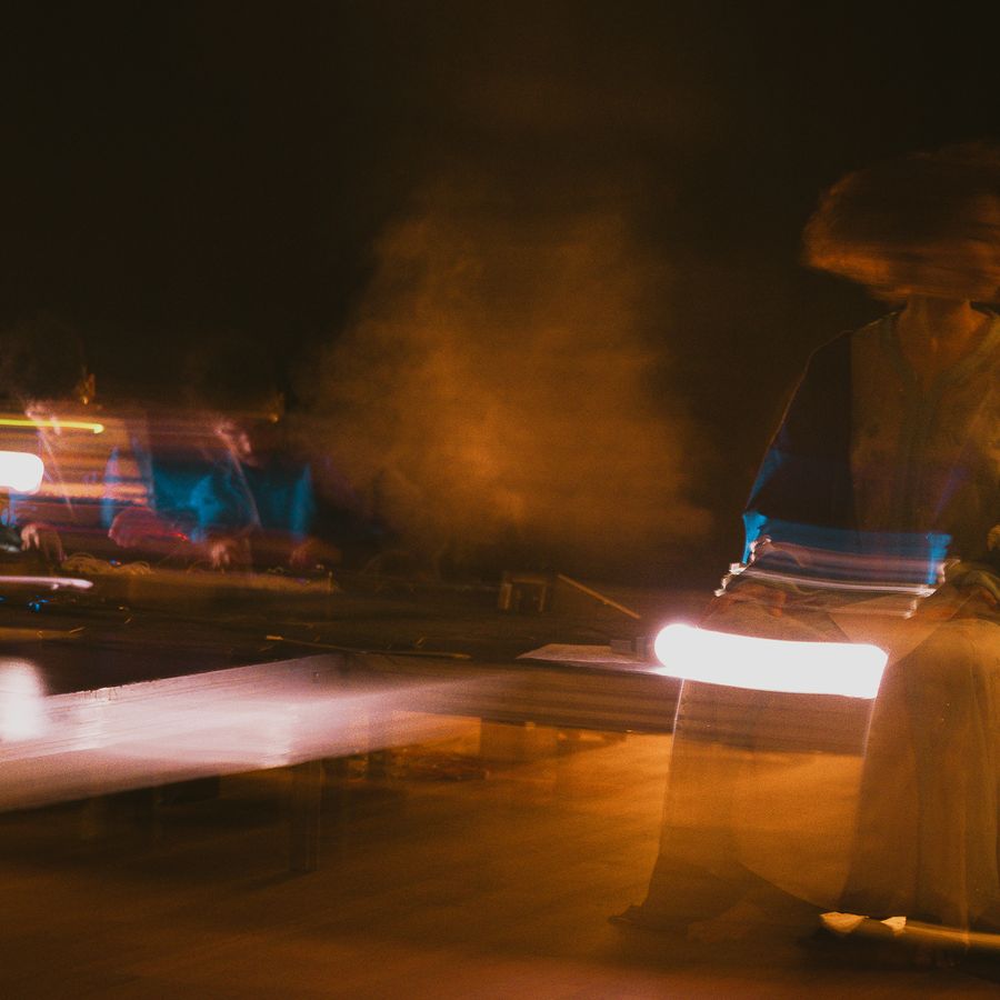 De trance-toestand staat centraal. In Gnawa-ceremonies is trance geen escapisme, maar genezing; ze laat het lichaam zijn jnoun onder ogen zien, ermee dansen, ze erkennen en zich zo verzoenen met wat het verstoort. AJJIT werkt met datzelfde principe, maar via theater en elektronica. Reda wordt de Maalem, de meester van de ceremonie die de ruimte leidt met muziek. Khadija belichaamt de cheikha, de danser-entertainer die zonder grenzen leeft en altijd klaarstaat om zich over te geven aan het ritme. Tegelijk draagt ze het spoor van Lalla Mira, de geest die verbonden is met geel, met vreugde, met de drang tot dansen. Ze neemt de microfoon, zingt in herhaling, haar gezicht soms gesluierd. In Noord-Afrikaanse vieringen zijn sluiers nooit eenduidig: soms symbool voor bescheidenheid, soms vermomming, soms een toestemming voor een andere staat van zijn. Hier worden ze een middel om zich volledig los te laten. Tussen deze twee figuren door kanaliseert Khadija vrijheid, intensiteit en de onvoorspelbare energie van het ritueel, ze roept de jnoun op terwijl ze via stem, beweging en puls de ervaring van het publiek vormgeeft. Het bewustzijn van de ruimte komt hierin los, en luisteren wordt een gezamenlijke, haast buitenaardse praktijk.