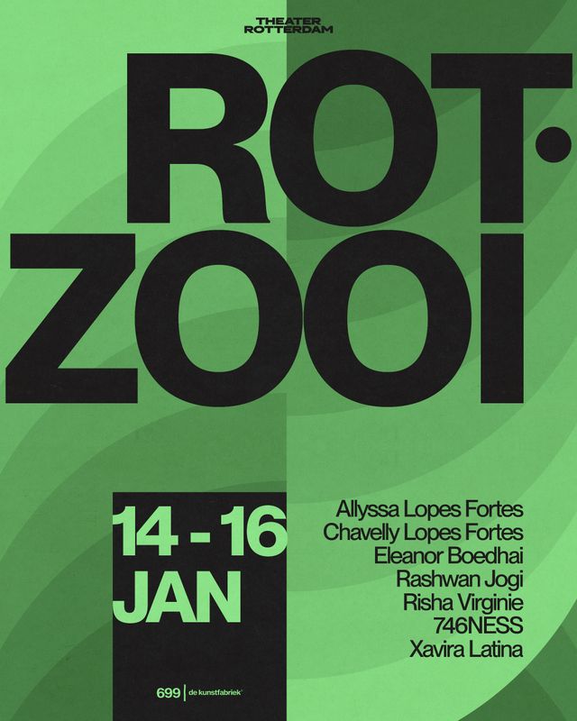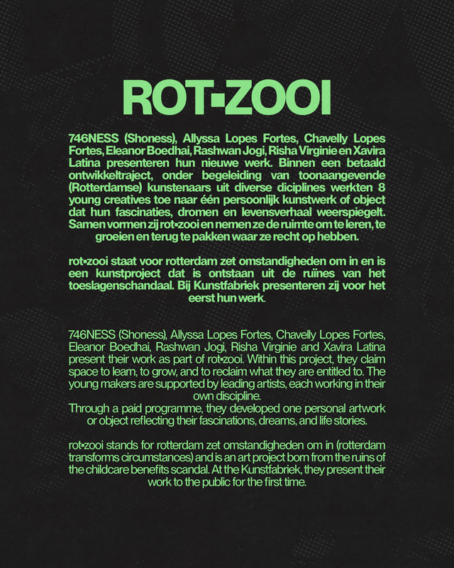 746NESS (Shoness), Allyssa Lopes Fortes, Chavelly Lopes Fortes, Eleanor Boedhai, Rashwan Jogi, Risha Virginie en Xavira Latina presenteren hun nieuwe werk. Het werk is voor het eerst te zien van woensdag 14 januari t/m vrijdag 16 januari bij de Kunstfabriek in het Groothandelsgebouw.